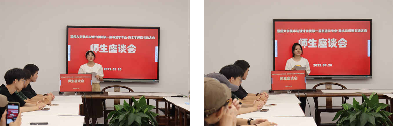 会上,20级美术学(师范)书法方向学生代表詹潇娴发言。她提出了字、笔、心三者合一的见解,分享了对书法的热爱,希望能在之后的专业学习中给学弟学妹们做好榜样,相互扶持,共同进步。22级书法学专业新生代表王怡菲发言。她分享了对大学生活的感受和期望,表达了继承学校优良传统,脚踏实地,坚守使命,共同书写温大书法学历史,成就专业学科发展的决心。