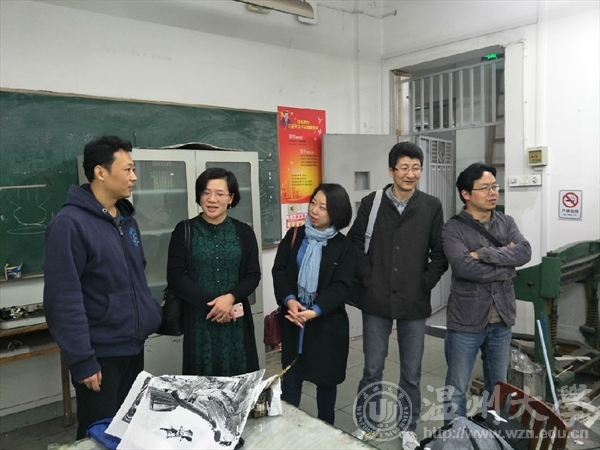 4月11日上午10:00,色色小说 教学副院长谢子静、美术系主任陈旭海、理论教研室主任胡建南、油画教研室主任丁海涵、国画教研室主任楼晓勉、教学科副科长邹青等老师来到位于金华市的浙江师范大学美术学院教学交流,该院院长邱兴雄和教学副院长施俊天、美术学系王琴主任、朱教授接待了我们。 邱院长和色色小说 谢子静副院长就美术学师范专业办学历史、办学理念、办学特点及美术学工作室建设等方面进行了深入的交流。教学副院长施俊天等负责人向我们详细介绍了版画、水彩、油画、国画、书法等专业方向的课程设置、工作室分类建设、师范生就业等具体情况,和我们进行了深入的交流和探讨。 下午,我们在该院尹小斌教授、薛磊老师等专业教师的陪同下冒雨参观了版画、水彩、国画、油画、书法等专业工作室。
