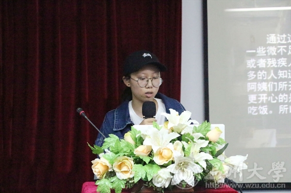 大会伊始,十位实践队负责人以PPT或者VCR的形式,直观生动地向在座的老师和同学们进行了实践成果展示。并向评委们讲述了在实践过程中发生的故事,感谢了每一个队员所付出的努力,并分享了实践时共同收获的欣喜。鞋蕴传承实践队队长张淑颖代表实践队员详尽地介绍了这15天来实践队的每一次活动,每一次进步,每一份认真,每一份团结。她说:“回忆鞋蕴传承实践队6年来的发展历程,鞋蕴的传承内涵是要有一份“工匠”精神,以及坚持“不忘初心,方得始终”的品质。”“艺韵晚霞,我们在行动”实践队走进敬老院关爱空巢老人,志愿义工和街头调研让更多的人深刻的了解有关空巢老人,呼吁更多人关爱老人。“绘暖向南”实践队前往文成县大峃镇樟台乡希望小学,通过生动的创意动物系列墙绘、立体逼真的3D墙绘和以师德师风为主题的中国风系列墙绘让原本空白破败的教学楼墙面一下子焕发了活力……。通过展示的成果评分,“同爱同行”、 “畲艺”、“绘暖向南”、“鞋蕴”、“艺韵晚霞,我们在行动”五只实践队队长荣获院“优秀实践队长”的荣誉称号。