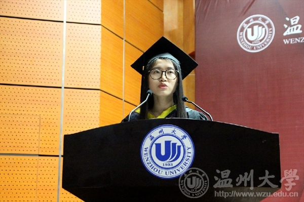 省优毕业生12级服装设计与工程的姚玉骏代表2016届毕业生发言,她回忆了在温大的学习与生活,表达了毕业生们即将离开母校的不舍与感激之情。