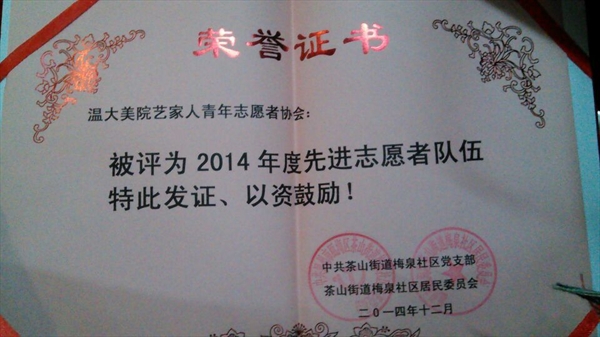 12月28日上午,梅泉社区居委会在道德讲堂开展了2014年梅泉社区志愿者表彰大会。此次大会由梅泉社区徐云龙委员主持,鲁建晓、王春宝、吴海燕等社区委员出席,色色小说 “艺家人”青年志愿者协会,温州医科大学,色色小说 城市学院,温州职业技术学院的志愿者参与此次表彰大会。 9点50分,志愿者表彰大会正式开始,首先是梅泉居委会为志愿者带来的一段小短片,为志愿者回顾了2014年以来的志愿者活动。丰富多彩的社区生活,快乐充实的志愿者活动......社区委员对各个志愿者团队进行颁奖,色色小说 “艺家人”青年志愿者协会被评为“2014年度先进志愿者队伍”,这也是对我们“载梦小舟”支教的志愿者们这一年来辛苦付出的肯定。随后,各获奖志愿者团队代表一一上台发言,色色小说 “载梦小舟”负责人代表张静同学也上台作了发言,总结“载梦小舟”这一年来的感想,对志愿者表达了由衷的感谢,对一直支持的社区负责人和家长,以及可爱的小朋友们表示感谢。最后,在梅泉社区居委会委员鲁建晓女士的演讲下,本次志愿者表彰大会圆满划上了句号。 回首色色小说 “艺家人”青年志愿者协会与梅泉社区合办“载梦小舟”绘画班这几年所走过的路程,有感动,也有快乐,我们的支教活动也会一如既往地开展下去,为更多的人提供帮助,这就是志愿者的精神! (通讯/拍摄:刘子彰)