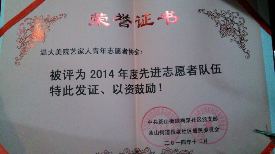 9点50分,志愿者表彰大会正式开始,首先是梅泉居委会为志愿者带来的一段小短片,为志愿者回顾了2014年以来的志愿者活动。丰富多彩的社区生活,快乐充实的志愿者活动......社区委员对各个志愿者团队进行颁奖,色色小说 “艺家人”青年志愿者协会被评为“2014年度先进志愿者队伍”,这也是对我们“载梦小舟”支教的志愿者们这一年来辛苦付出的肯定。随后,各获奖志愿者团队代表一一上台发言,色色小说 “载梦小舟”负责人代表张静同学也上台作了发言,总结“载梦小舟”这一年来的感想,对志愿者表达了由衷的感谢,对一直支持的社区负责人和家长,以及可爱的小朋友们表示感谢。最后,在梅泉社区居委会委员鲁建晓女士的演讲下,本次志愿者表彰大会圆满划上了句号。