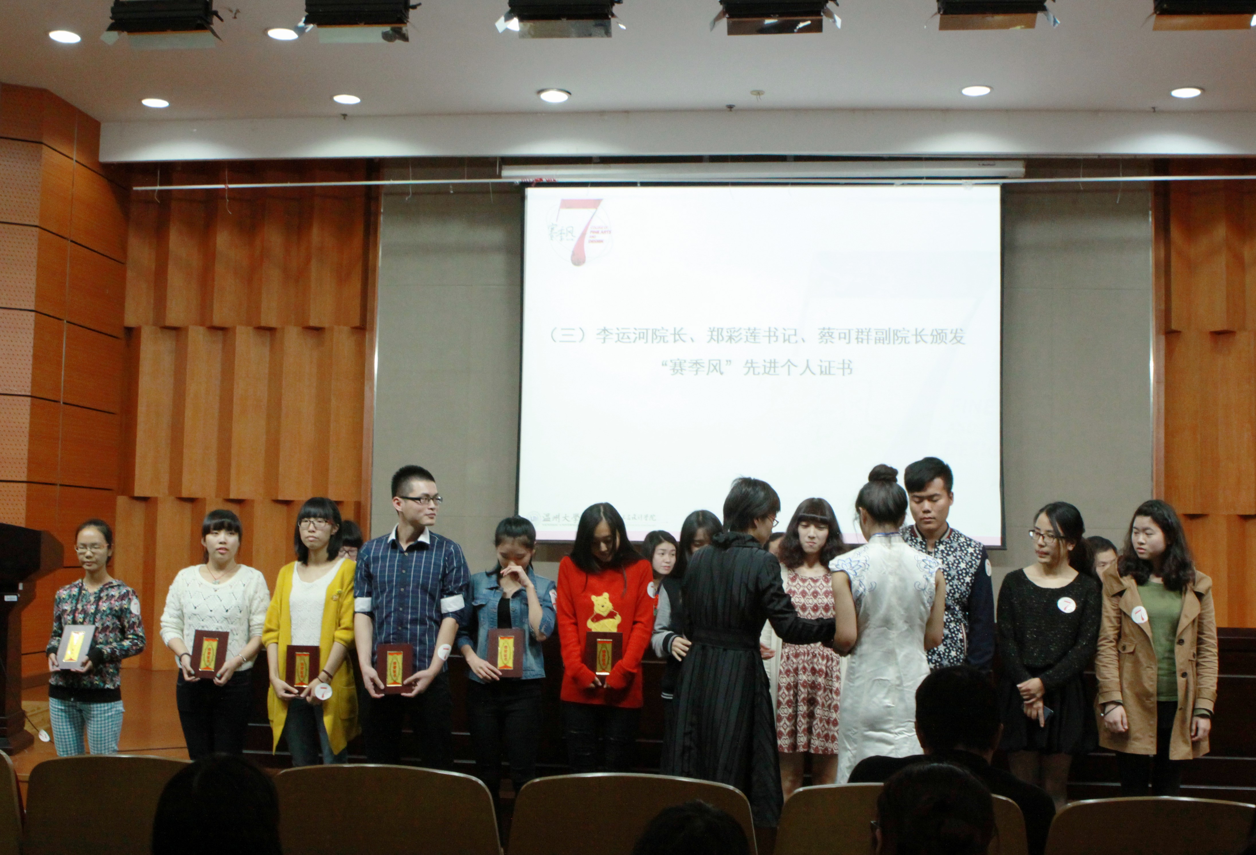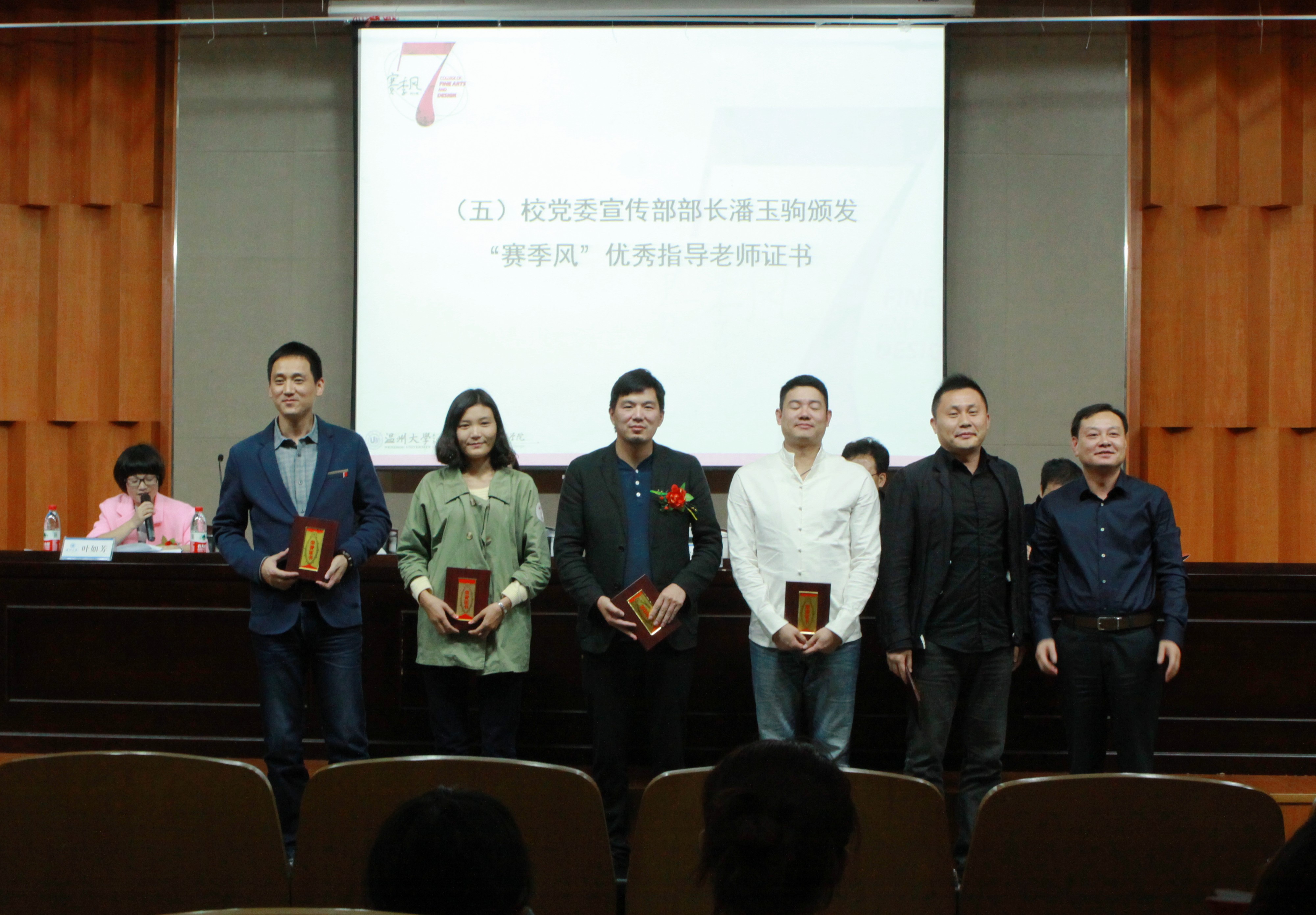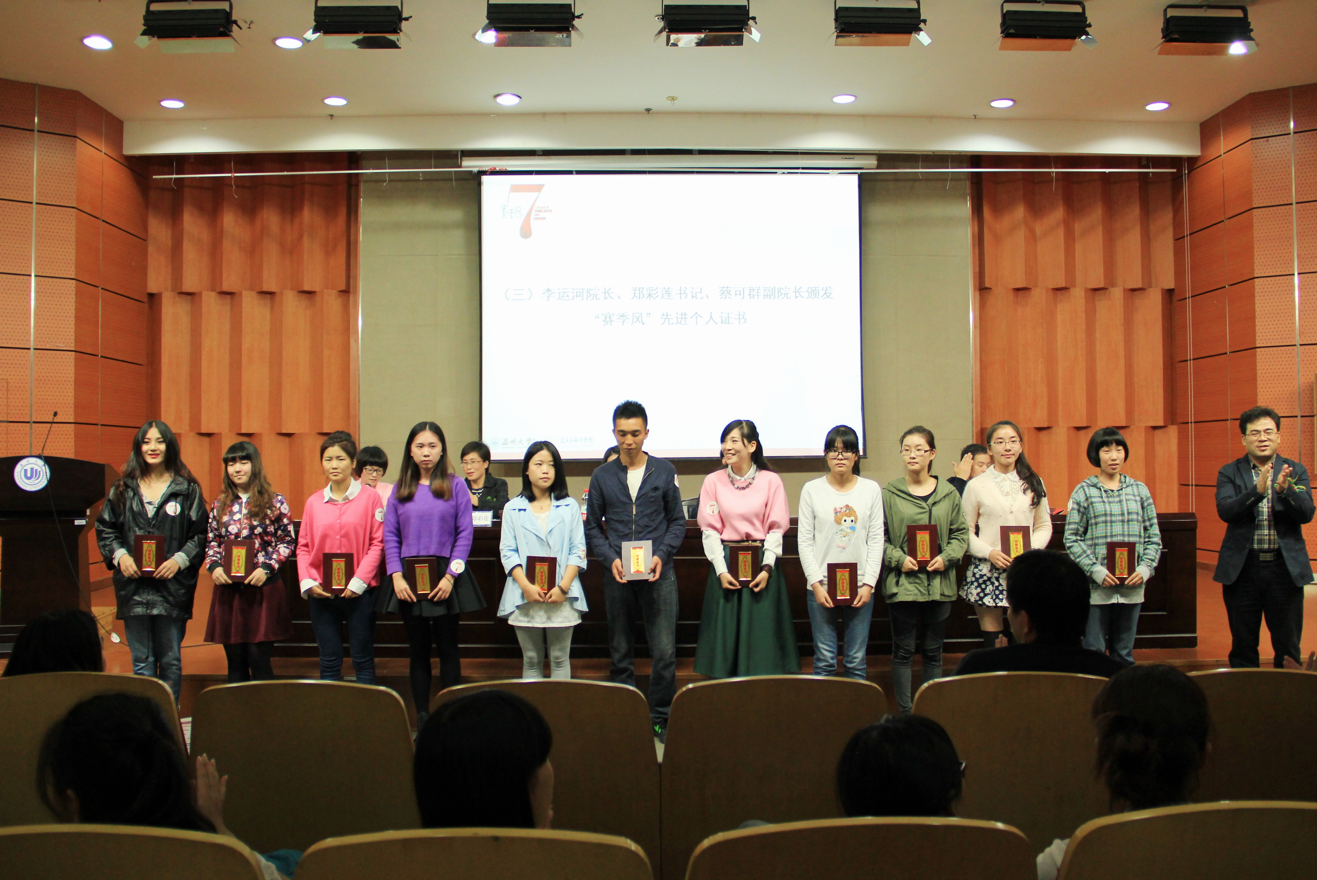 在开启新一届的“赛季风”之前,大会回望过去一年的辛苦付出与满满收获,表彰在上一届赛季风取得优异成绩的同学。2014年度大学生创新创业奖表彰大会在激昂的乐曲中开始。首先由蔡可群副院长代表组委会宣读了第六届“赛季风”活动孵化的优秀作品名单,其中,国际国家级奖项3项,国家学会级和省级奖项7项,省学会级和市级奖项23项,此外还有校级奖项83项。作品内容涵盖美术、服装、设计、创新创业四个方面,包括鞋靴、服饰、书画、摄影、海报、广告、创业项目等等。一件件精美的作品后面是参赛同学与指导老师的智慧、创意与汗水。