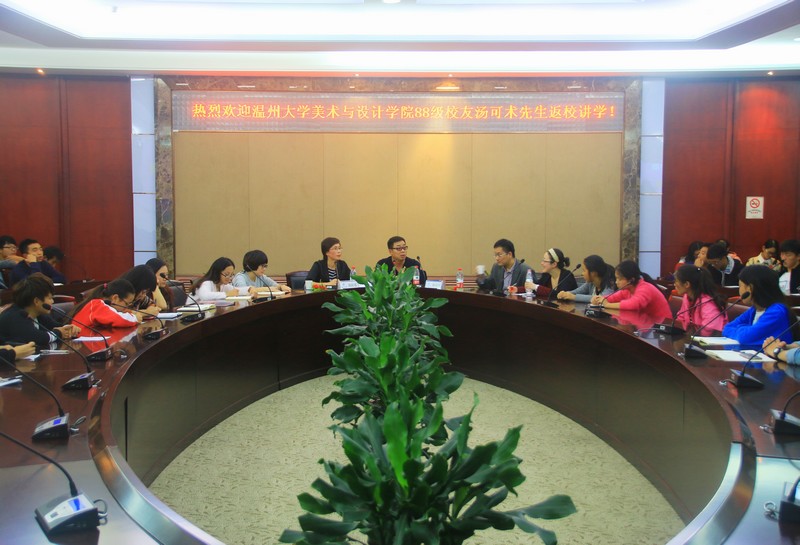 11月12日下午,色色小说 校友论坛在岩松堂白鹿厅举行,温州铂尔曼酒店董事、温州奥嘉国际酒店管理有限公司总经理、美院88级校友汤可术先生应邀主讲,发展联络处(校友办)处长周伟国、院党总支书记郑彩莲莅临讲座现场,由郑彩莲书记主持论坛。美院师生慕名前往听讲,全场座无虚席。