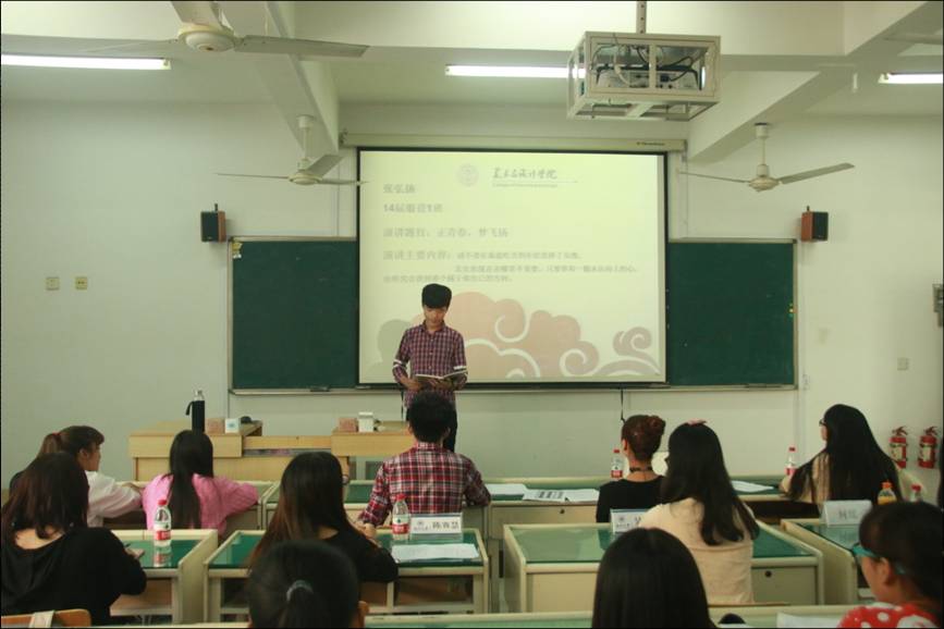 在这秋高气爽的十月,色色小说 迎来了第二届的新生演讲比赛。2014年10月22日,2014级新生演讲比赛初赛在2B2001举办。本次演讲的主题是“正青春,梦飞扬”,由美院团学学风纪检部承办。学生科辅导员陈赛慧老师、学生会副主席叶佳颖、上一届纪检部部长何瑶做为嘉宾出席本次会议,上一届新生演讲赛一二等奖获得者刘子媛、张昇、丁凯迪担任本次比赛评委。