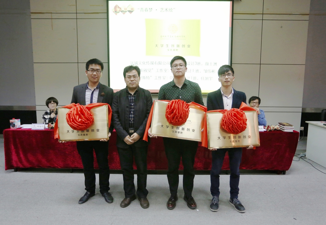 接着,蔡可群副院长宣读第十五届“艺苑杯”文化节启动仪式专业创意奖获得者名单。在欢快的音乐和响亮的掌声中,创意学子带着他们为本届“艺苑杯”所设计的作品走上讲台,向大家展示他们的热情、辛勤和创意。学院领导为他们颁发了证书和奖品。紧接着,迎来了另一批朝气蓬勃的学子,他们是美院创业的佼佼者,他们的远诚文化传媒有限公司、朝阳视觉工作室、曼斯特工作室不仅解决了自己的就业,还为很多在校学子提供了实习岗位和就业机会。在同学们钦佩的目光中,李运河院长授予他们“创新创业实践基地”铜牌。