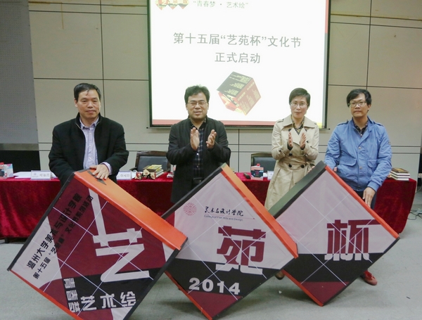 在致辞中,郑彩莲书记感叹于同学们的才华和创意,对仪式现场的宣传册、邀请函、礼品赞叹不已,对活动能够结合专业、激发创意表示赞赏和欣慰。然后,她用林徽因的诗句“是爱、是暖、是希望”生动展现了“艺苑杯”所营造的“四月天”般的艺术气息。她回顾了“艺苑杯”十四年励志奋进、创新进取的历程,肯定了十四年来“艺苑杯”为促进艺术展示和创作交流、提升学生才华技艺和实践能力、营造艺术氛围和学习环境,推动人才培养和学院发展所做出的贡献。接着,她赞扬了美院学子在过去一年里为响应“中国梦”号召所开展的诸多活动及所获收益,并指出今年的“艺苑杯”将继续发扬“中国梦”的指导思想,以“青春梦·艺术绘”为主题,号召学子们用青春和梦想点燃创作的激情和灵感,用精湛的作品和优秀的成果描绘瑰丽夺目的青春梦想。最后,她希望同学们有“敢于有梦、勇于追梦、勤于圆梦”的意志品格,去参与“艺苑杯”,去实现“青春梦”。