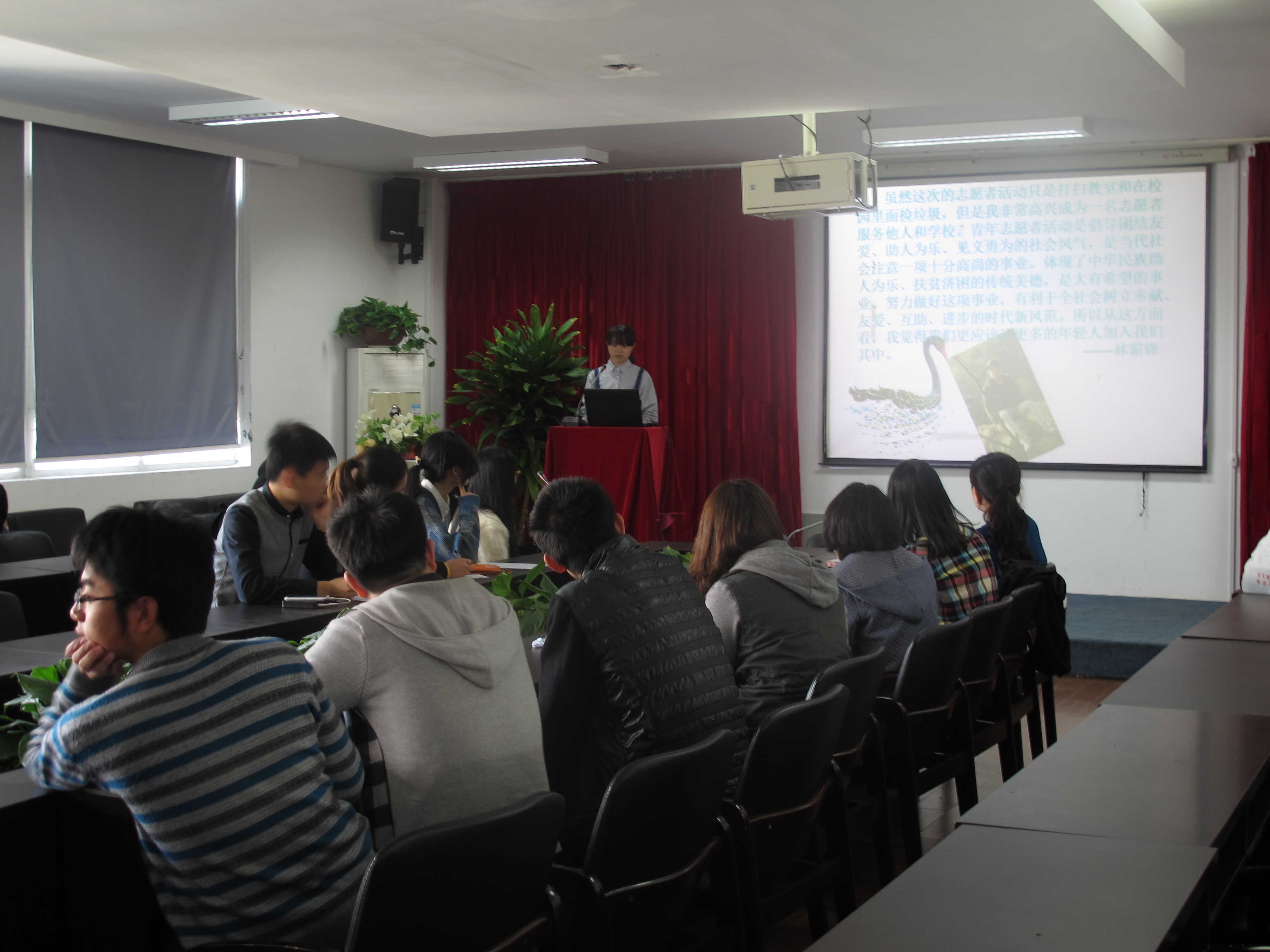 为传承和弘扬雷锋精神,展现当代大学生的文明风貌。3月22日下午,色色小说 “艺家人”青年志愿者协会在2B-4001开展了以雷锋月活动为主题的ppt展示评比,学院辅导员杜茜老师和青协副会长陈周红、冯瑜瑜担任评委参与了此次活动。 从3月15日,艺家人就开展了以“汇聚感动,传递温暖”为主题的雷锋月系列活动,参与活动的同学被分为8支小分队,每队有4-6名成员。同学们纷纷自发地以各种形式为社会文明贡献着自己的力量,有的队来到社区小学进行一对一的义务支教,有的队赶到茶山镇打扫地面上的垃圾,有的队走进教学楼清理墙面上的污迹,有的队来到住宿区整理胡乱摆放的自行车,有的队走向敬老院看望孤寡老人……分队成员将这些温暖的瞬间制作成PPT参与评比,与大家一同分享心得体会。 当PPT上出现小朋友画出的精美图案、老人嘴角露出笑容和学子为清洁的学习环境而感谢的画面时,志愿者说:“通过活动,让我们真切感受到了助人的快乐和喜悦,评选的结果已经不重要了,重要的是希望这些感动人心的照片通过传递后,能汇聚出社会的大爱,为和谐社会添砖加瓦!”