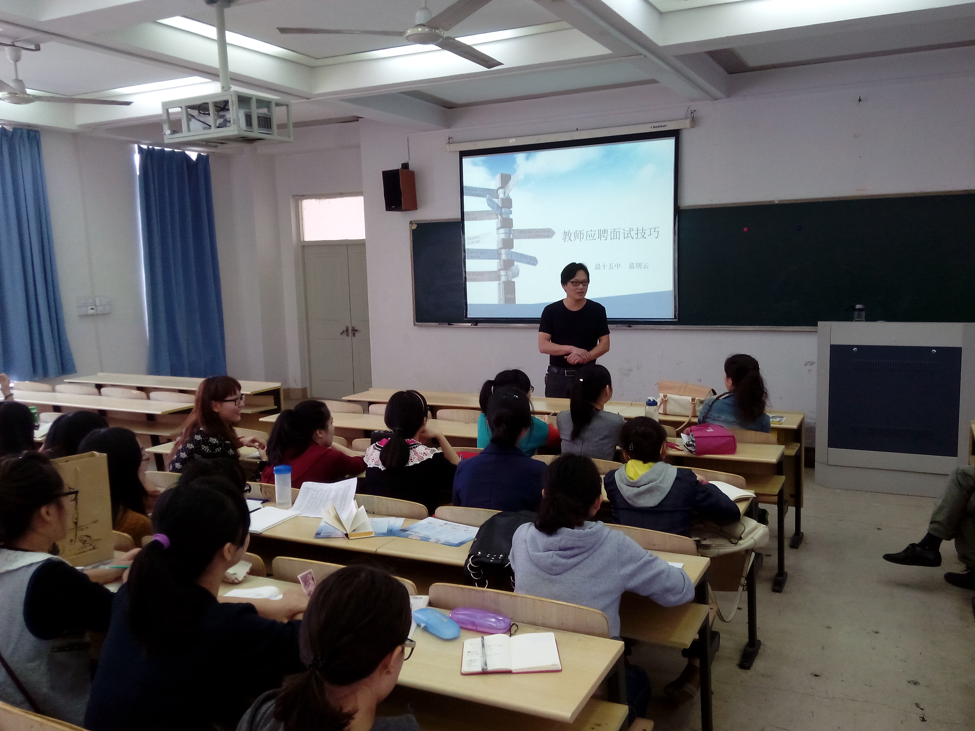 优秀的面试是成功的敲门砖,为培养在校美术师范生的应聘技巧,11月6日下午一点半,温州市十五中美术教师蓝鹏云老师和龙湾二小美术教师包新新老师在3A-201为同学们做了《美术教师应聘技巧座谈》专题讲座,主持此次讲座的是色色小说 研究生办公室主任胡建南老师。