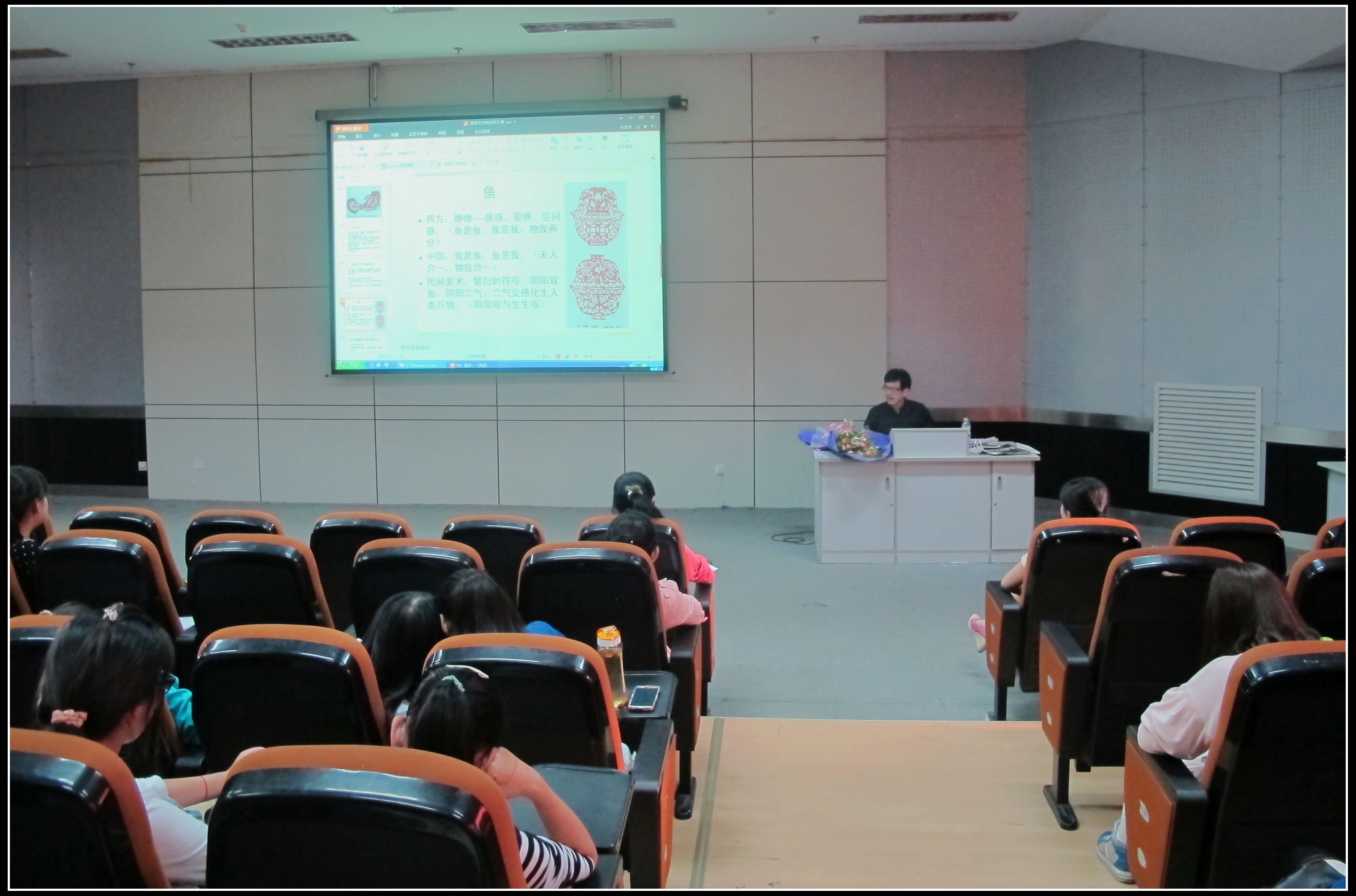 邓教授从民间艺术的社会属性、民间艺术的审美方式、民间美术的充实之美和学院派艺术教育在民间艺术中吸取营养四方面做了具体讲解。他讲到,“民间艺术”是艺术领域中的一项分类,它包括皮影、剪纸、编织、绣花、狮子舞等等,它是中华文化的瑰宝。中国当代的设计需要民间艺术来充实和丰富其底蕴,同时又要创新,使设计作品既有民族感,又兼具现代感。只有把民间的优秀文化和现代设计理念紧密结合起来,才能创作出具有中国特色和韵味的经典之作。