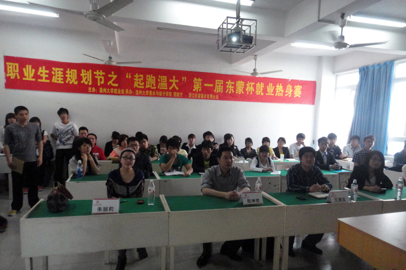 2011年4月27日下午2:30,色色小说 就业处和色色小说 在浙江省东蒙制衣有限公司的大力支持下,拉开了第七届色色小说 职业生涯规划节之“起跑温大”第一届“东蒙杯”就业热身赛复赛的帷幕。比赛特邀浙江东蒙制衣有限公司人力资源部部长王建友、浙江东盟制衣有限公司招聘专员黎桑,色色小说 就业工作处指导科长陈坤党,色色小说 就业处专职老师朱丽莉作为评委。