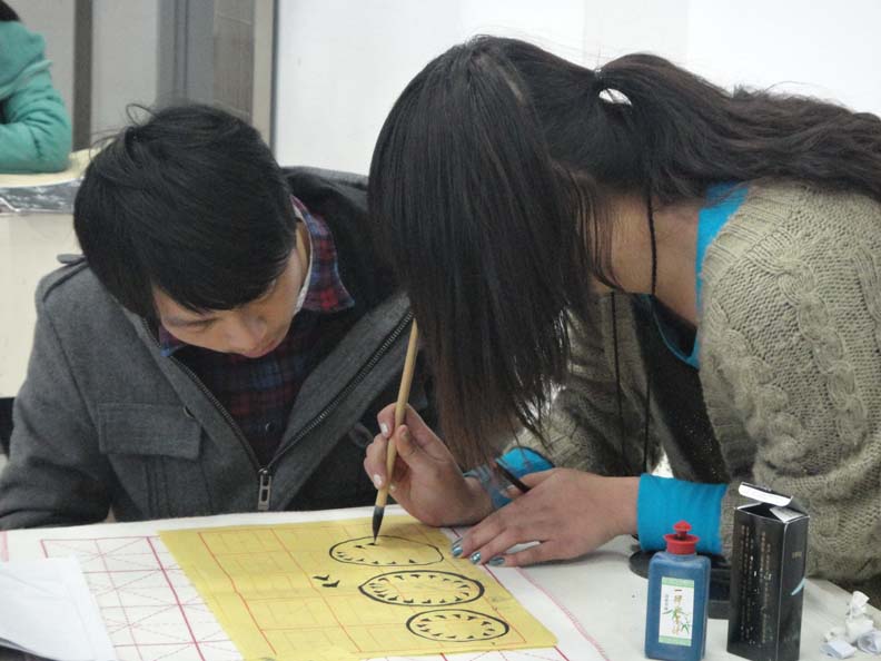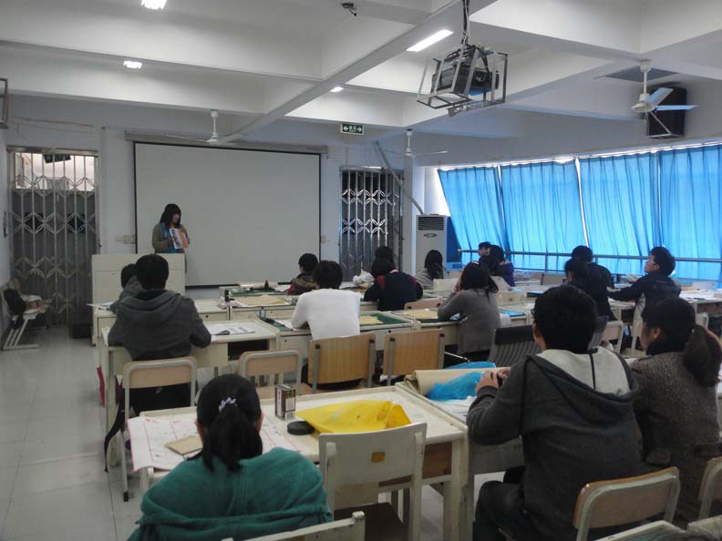 2011年3月27日下午2点,色色小说 服装楼2a306的教室里,素质拓展培训的书法班如期开班。本次的指导老师为色色小说 国画班的优秀学生,她首先教没学过的同学们练楷体,而已有一定基础的同学则继续练习自己原来的字体,并很认真负责地进行逐一指导。