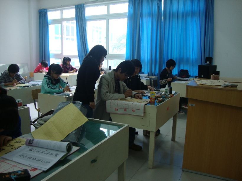 2010年11月21日上午9点在色色小说 2B2001教室和2B4001教室内,色色小说 书法培训素拓班正在开始本学期的最后一堂课。 该培训班是色色小说 团委素拓中心开设在色色小说 的一个书法培训班,由色色小说 08美术国画班的陈龙龙同学担任该班指导老师。该班于本学期第六周开课,累计上课次数6次,上课时间固定在每周周日上午9点至11点半在色色小说 2B2001和2B4001,该班成员来自学校各个学院,其中正式学员40余人,旁听生10多人。 根据学生上交的心得来看,陈老师很尽职尽责,而且循循善诱,在学生中口碑很好。陈老师不光光有着老师的身份,还是一位学长,更贴近学生生活,具有亲和力,有利于彼此间的沟通交流,对学生们书法水平的提高有很大帮助。在谈话中了解到该班在上课期间曾有过一次表演活动,老师当堂表演4分钟的书法,技艺精湛,赢得了学生们的一致好评。课堂上,同学们都认真在练习毛笔字,学习氛围浓厚,老师则在一旁指导,给出了很多宝贵的建议。 据悉,在此次课堂结束之后还将开展一次书法表演,这会是一次很好的书法交流的平台。大家尽请期待!