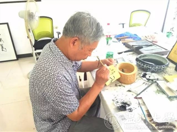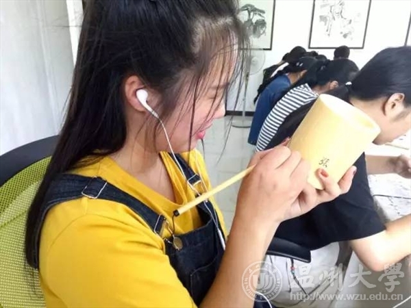 2017年7月5日,温大美院“艺韵晚霞”暑期社会实践队前往温州永嘉县瓯窑小镇,向民间艺术家学习被列为非遗之一的永嘉竹雕。此次活动受到了校领导的广泛关注,并将活动成果对台湾交流生进行了介绍和展示。 沿着龙头村便道驶入“瓯窑特色小镇”。“瓯窑小镇”四个大字跃入眼帘,在粉墙黛瓦的衬托下,浓厚的古风扑面而来;经过刚拓宽的水泥路,一片白墙上绘有描述古时烧制窑器的水墨画,象征坦头瓯窑遗址出土的青釉褐彩器物的龙下窑雕塑竖立在画前,让人感到一股浓浓的文化氛围。仿古竹雕第一人金可兴 温州浙楠书画院副院长世界画家协会会员中国工艺美术家协会会员法国书画家协会副主席中国当地百名优秀书画家之一 经过专业老师的指导,大家便尝试着进行笔筒木刻。 大家把笔筒横放,一手把着笔筒一手拿着刻刀,仔细地按着画好的纹路一点点地刻着,在专业老师的指导下尝试用不同的刻刀,不放过任何边边角角。 刻好后再用磨砂纸细细打磨,接着用毛笔进行上色工作。竹子,兰花,人物头像……一个个生动形象,让人不禁想凑近细细观察。 最后大家都在笔筒上刻上自己的名字留作纪念。 此次活动中,队员们不仅深入了解了瓯窑小镇,更深刻懂得了作为当代青年有责任尽自己的努力去保护非物质文化遗产,使得这些文化能够得到保护,从而可以更好的传承和发扬,因为它蕴含着中华民族特有的生命力、思维方式和想象力,是各民族智慧的结晶,也是全民族的瑰宝。台湾交流生前来参观 随着时代的变迁,越来越多的优秀文化消失在历史的长河中,而这一损失是不可弥补的,所以我们必须尽自己最大的努力去保护并传承它,哪怕只是一点点!
