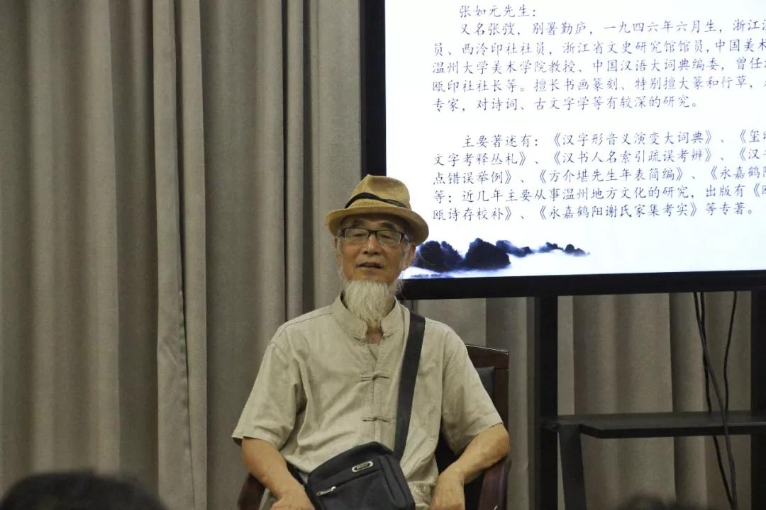张如元老师曾任温州师范学院美术系主任,温州市书法家协会副主席,东瓯印社社长,中国美术学院书法系客座教授,浙江省文史研究馆馆员,西泠印社社员。他擅长书画篆刻、特别擅大篆和行草,是古文字学领域的著名专家,对诗词、古文字学等有较深的研究。1977年被抽调为国家重点科研项目《汉语大词典》编写,1994年被教育部指定为《汉语大词典》审稿定稿人,2002年被聘为《汉字形音义大词典》形系主编,2003年至今都在中国美术学院讲授古文学和书画题跋。退休后受温州博物馆邀请担任学术顾问,2013年被聘为温州县志编写顾问。他的主要著作有《汉字形音义演变大词典》、《玺印文综》、《战国玺印文字考释丛札》等论著;近几年主要从事温州地方文化的研究,出版有《瓯海轶闻校笺》、《东瓯诗存校补》、《永嘉鹤阳谢氏家集考实》等专著,此外还举办了个人书画作品展。张老师在原温师院任教期间严谨治学,桃李满天下,为温州培养了很多优秀的艺术人才。