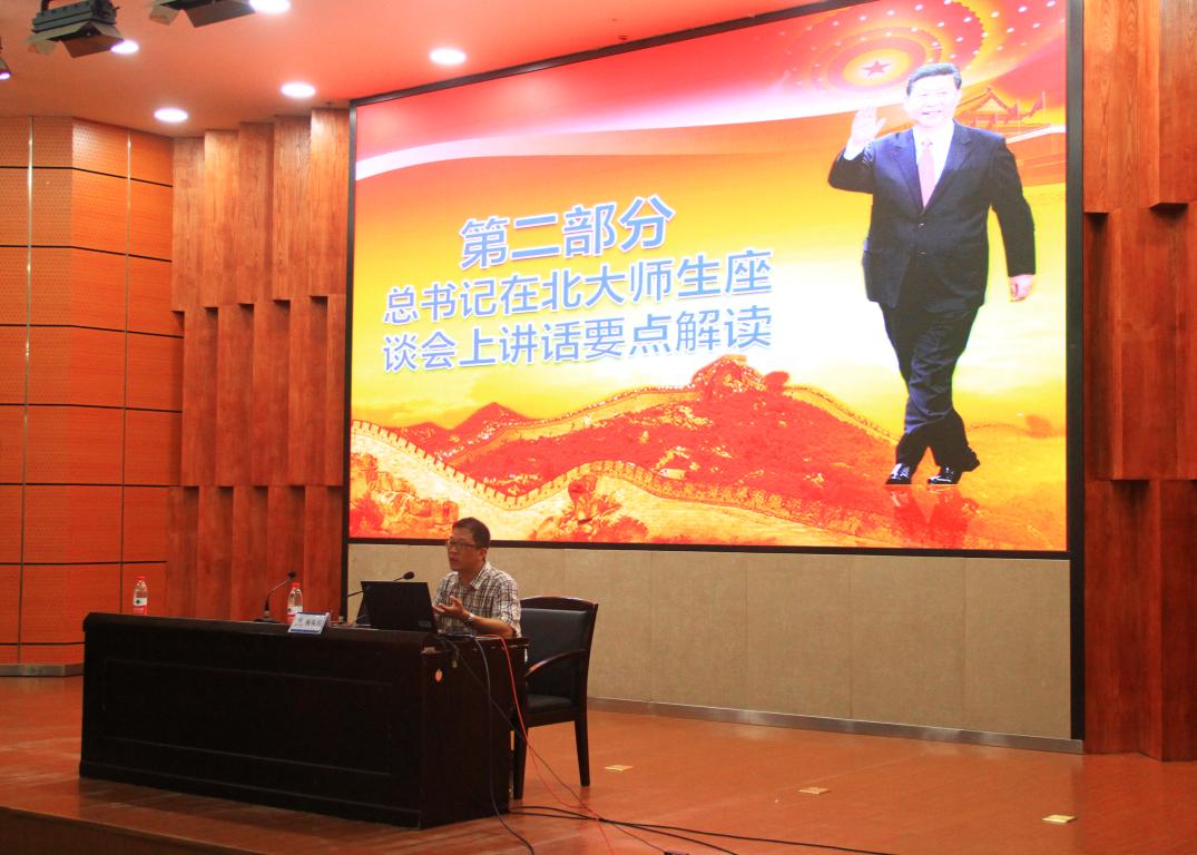 7月4日下午,色色小说 在岩松堂雁山厅组织开展形势与政策课教学,学院党总支副书记杨振海为17级全体同学做“坚持立德树人培养时代青年 加快内涵发展建设高教强国——习近平总书记在北大师生座谈会上的讲话精神解读”报告。杨书记报告分为三部分,第一部分是总书记莅临北京大学考察的简要回顾,第二部分是总书记在北大师生座谈会上讲话的要点解读,第三部分是学习习近平总书记讲话精神要自觉增强五个自觉。杨书记指出,习近平总书记在北大师生座谈会上的讲话是当的十九大以来,总书记面向高等教育乃至整个教育战线发表的首次重要讲话,对新时代的高等教育工作做出了系统论述,具有很强的战略性、政治性、思想性和针对性,是习近平新时代中国特色社会主义思想的重要内容,是深化教育综合改革、办好社会主义大学的根本遵循,也是青年学生成长成才的行动指南。杨书记认为,总书记的讲话围绕“我们要培养什么样的人”“怎样培养我们需要的人”“青少年怎样成为这样的人”三个问题,分别从我国高等教育的一个根本任务、建设中国特色世界一流大学的三项基础性工作和对新时代青年的四点希望三个方面进行了深刻阐述。杨书记总结了学习习近平总书记讲话精神要增强五个自觉,一要增强走中国特色社会主义道路的自觉;二要增强加快高等教育内涵式发展的自觉;三要增强高等教育服务国家和社会的自觉;四要增强高校加强和改进党的领导的自觉;五要增强青年大学生全面成长成才的自觉。最后,杨书记勉励全体同学要不忘初心、牢记使命,关注时事政治,努力充实文化知识和专业技能,为实现中华民族伟大复兴的中国梦贡献青年大学生应有的力量。