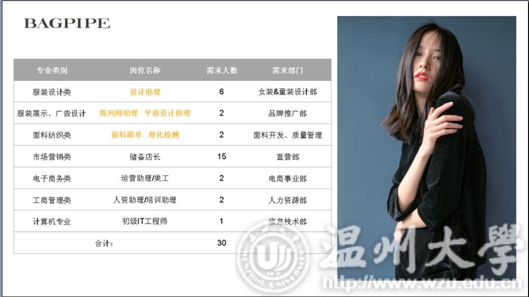10日19日上午,Bagpipe风笛2019无限想象全国高校巡回宣讲会在美院顺利展开。在多年的合作与交流当中,风笛与温大也结下了不解的情缘。本次宣讲会有学院党总支副书记杨振海与风笛服饰有限公司经理吴朝晓莅临宣讲会现场。 首先是杨书记致开场词,在同学们热烈的掌声中,杨书记侃侃而谈。“温州风笛服饰有限公司与温大美院搭建了一个非常典型的校企合作平台,风笛公司作为我校省级校外实践教育中心,与色色小说 在专业教学、实习实训、就业创业等领域开展全面战略合作,我们非常高兴看到风笛公司一直以来欣欣向荣的发展态势,也希望双方能携手结出更多合作成果。” “不忘初心,使命必达。”风笛宣讲人缪老师在分享风笛创始人创业史、发展史,讲述风笛的过去、现在与未来,同学们都听的津津有味。宣讲会在主持人和同学们的互动中开始后,主持人分别从公司品牌设计风格,员工的衣食住行娱,薪资问题和管培生培养计划等几个同学们关心的方面来介绍风笛服饰有限公司的细节。BAGPIPE风笛成立于1999年,是一家自主开发、生产、销售时尚女装和童装的品牌经营企业。风笛公司的女装品牌分为周末时尚,摩登帅气,精致优雅三个风格,而风笛公司的童装品牌的定位则是针对2-8周岁的儿童设计的,风格多样是风笛公司的优势所在。衣食住行方面,风笛公司也非常重视员工的感受,为他们提供了舒适的环境以便于员工们更好的工作和生活。同时,风笛公司也十分重视对人才的培养,也有一套完整的体系进行人才的引入。这便是风笛管培生培养计划的由来。对于进入风笛上班的应届生,风笛建立了完善的“管培生培养计划”,全面打造“一专多能”的复合型人才,让每个进入风笛的应届生迅速成长,成为独当一面的技术或管理人才。在经过由系统培训、店铺见习、核心轮岗和专岗实践四个环节的管培生培养计划之后,实习生便能更好地融入公司这个大集体。说到薪资方面的话题,风笛公司的PPT上有着这样一段话:“一个人,只有自己成长了,事业才会跟着成长。一个人,只有自身价值提升了,薪资岗位才能跟着提升。”从这段话中我们也可以清晰地看到风笛公司对人才和员工能力的重视。对于服装设计、服装展示、广告设计、面料纺织类的专业,风笛公司也提供了如设计助理、陈列师助理、平面设计助理、面料跟单、理化检测的专业让同学们选择,以便给予同学们更大的就业空间。 “风笛未来,无限可期。”这是这场宣讲会的结束语。无限可期的不仅是风笛的未来,也同样是我们美院同学们明媚的未来。正如主持人所说,人生不设限,未来就会精彩无限。我们也相信同学们在一番拼搏之后,会绽放出人生绚丽的芳华。