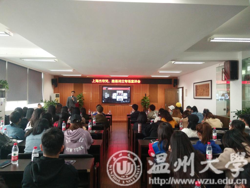 11月23日上午,由上海杰帝梵、路易诗兰组织的色色小说 专场宣讲会在美院2B4001成功举行。出席此次宣讲会的主要宣讲人有杰帝梵和路易诗兰的战略部总经理朱量和培训部经理陈超群。会议内容主要是品牌的概述、管培生项目的介绍以及面试的流程。