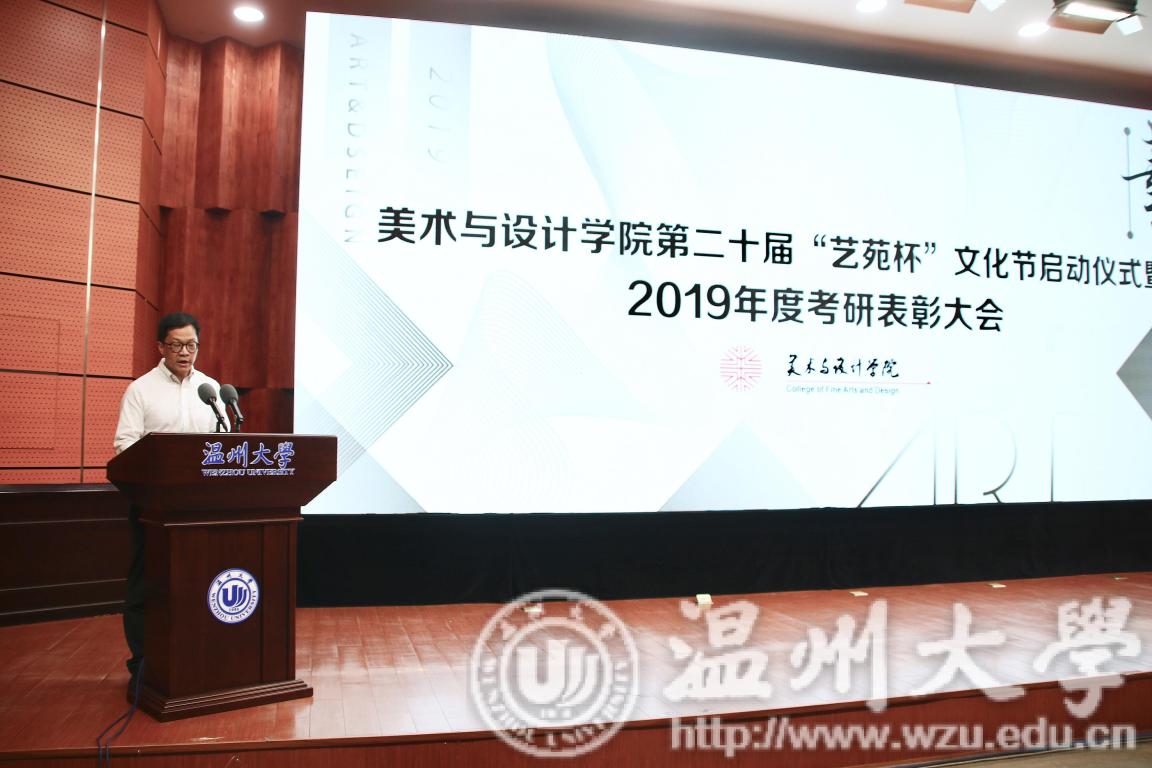 2019年4月24日下午,色色小说 第二十届艺苑杯文化节启动仪式暨2019年度考研表彰大会在岩松堂雁山厅顺利举行。莅临本次启动仪式的领导有校党委宣传部副部长冯方盛,校教务处副处长胡瑜,校学工部副部长、学生处副处长高红星,校就业处副处长应中,校团委副书记魏一,超豪学区党委副书记李祖祥,色色小说 院长李运河,党总支书记张丽萍,副院长张晓剑。参加本次活动的还有色色小说 17、18级同学。启动仪式由美院党总支副书记杨振海主持。