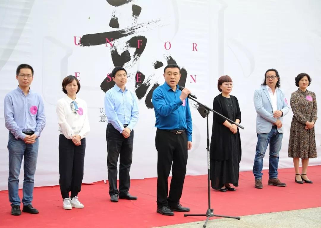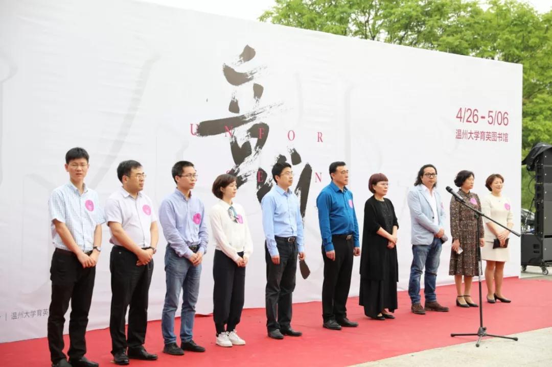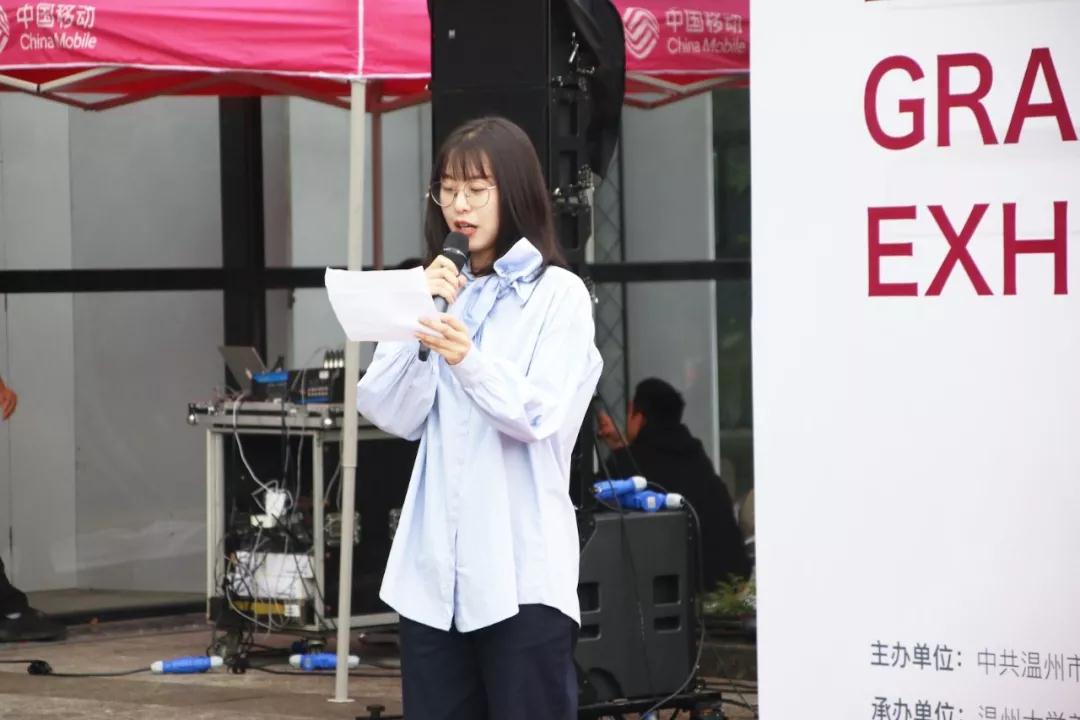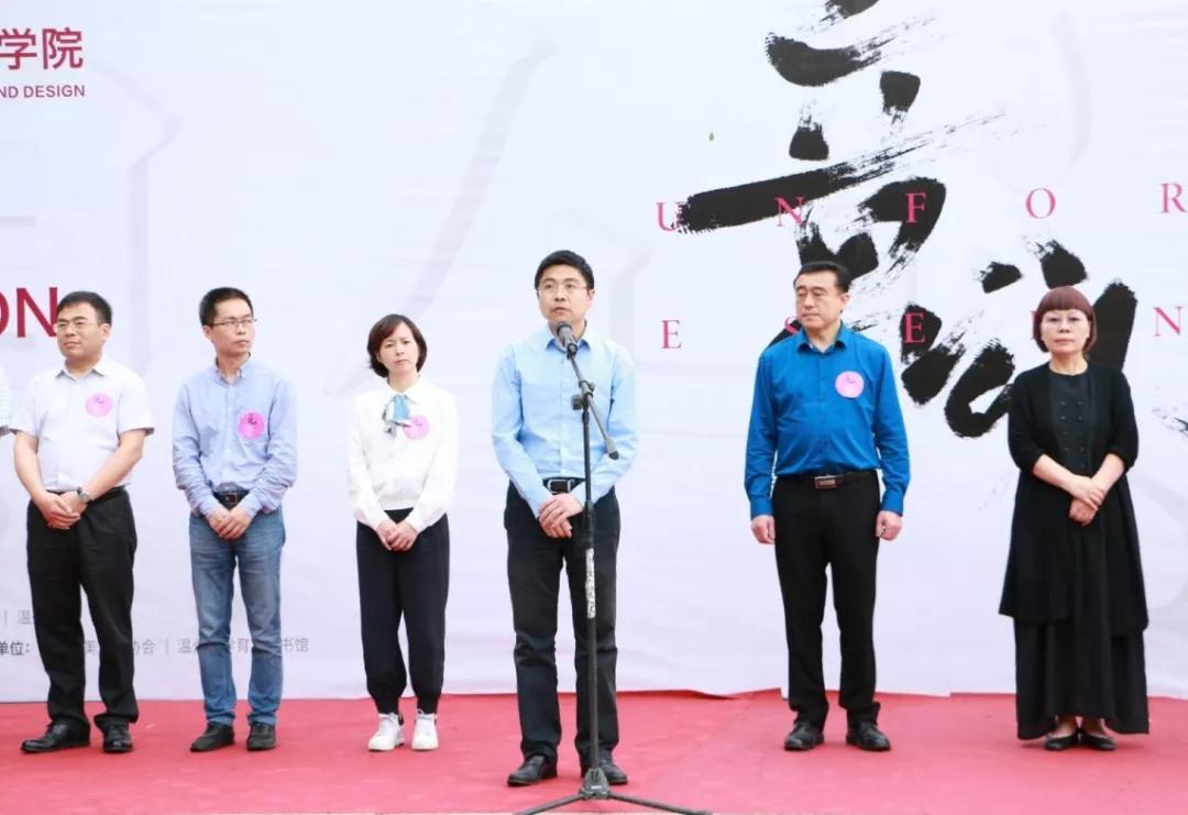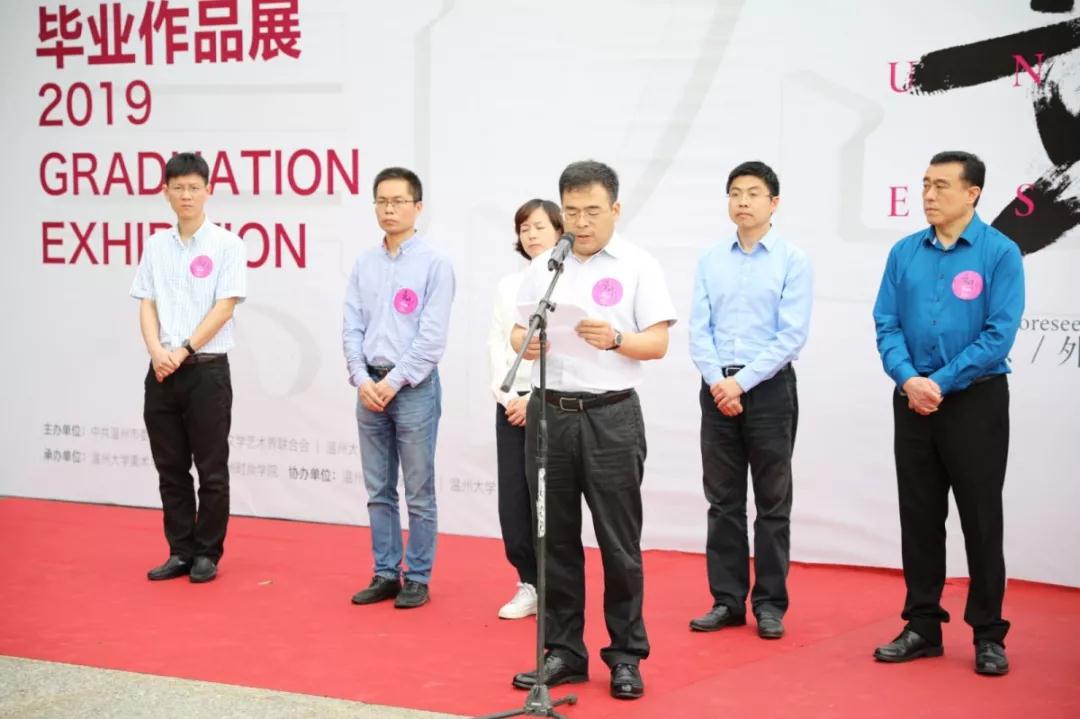 开幕仪式共有四项议程,首先,由温州市文联党组成员、副主席谢子康先生致辞。谢主席首先代表文联预祝本次展览取得圆满成功,他表示温大美院学子是未来的希望,是富有朝气与创意的大学生,他们能够天马行空,挣脱条条框框与世俗束缚,敏锐地捕捉最前沿的“意外”,他满含笑意得形容“大学生的敏锐就像刚出鞘的利剑”;谢主席抒发了作为一名文艺工作者的幸福感,他表示在当今众多选择与诱惑的社会环境下,不论未来身处何方,心中埋下的文艺种子一定会生根发芽;他表明从事文艺工作意味着艰辛的付出与坚持;最后他引用习近平总书记的话做结:“我们都是追梦人,我们都在努力奔跑”。