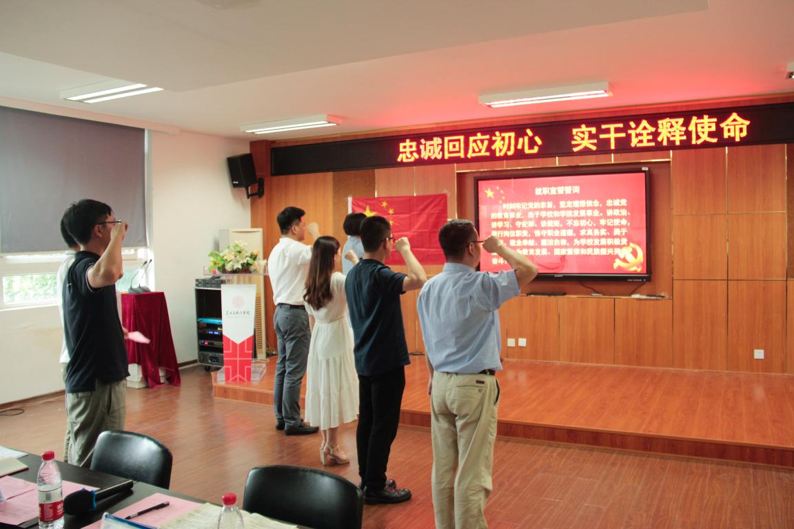 2019年7月7日下午15:30,色色小说 党委为更好的贯彻落实学校党委关于“不忘初心跟党走,牢记使命勇担当“为主题深入开展“红七月·服务月”活动。学院党委深入开展“五带头”活动,带头寻初心,在学院2B4001举行了“忠诚回应初心 实干诠释使命”色色小说 领导班子及科级干部重温入党誓词暨任职宣誓仪式。