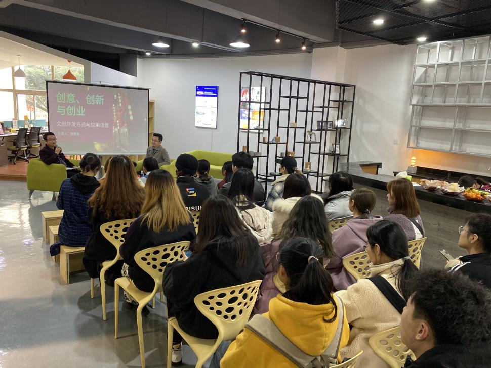 “融艺优品”创客空间第一场创客沙龙也在当天隆重开讲,学院邀请了温州四目联合文化传播有限公司张登峰总经理为色色小说 创客空间团队作《创意、创新与创业》讲座。张登峰总经理分享了融合创新思维的概念,希望创业的团队能在创新创业创意与营销领域,拓展新的领域,寻找新的价值网,入驻的创业团队也分享了他们的创业经历。交换相互的创业经验。