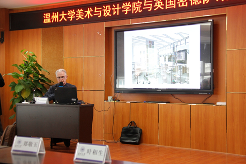 随后,David Fern博士对个人从业经历以及英国国立密德萨斯大学相关课程及设计趋势作了基本介绍,包括该校的地理位置和专业分类以及教学资源。其中,他重点提及了学院“以人为本”的教学理念,并就学生创意作品进行了建议和讨论。