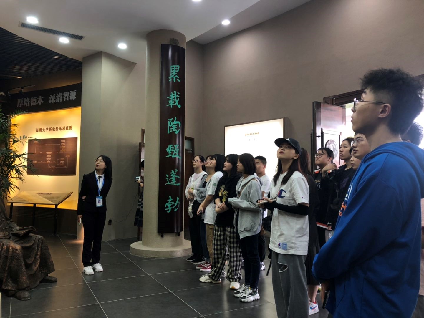 首先第一堂课是参观了温大校史馆,新生们认真聆听着讲解员的介绍,观看馆内陈列的文物,通过这些展示使大家充分了解到温大悠久的历史和优秀的文化底蕴。