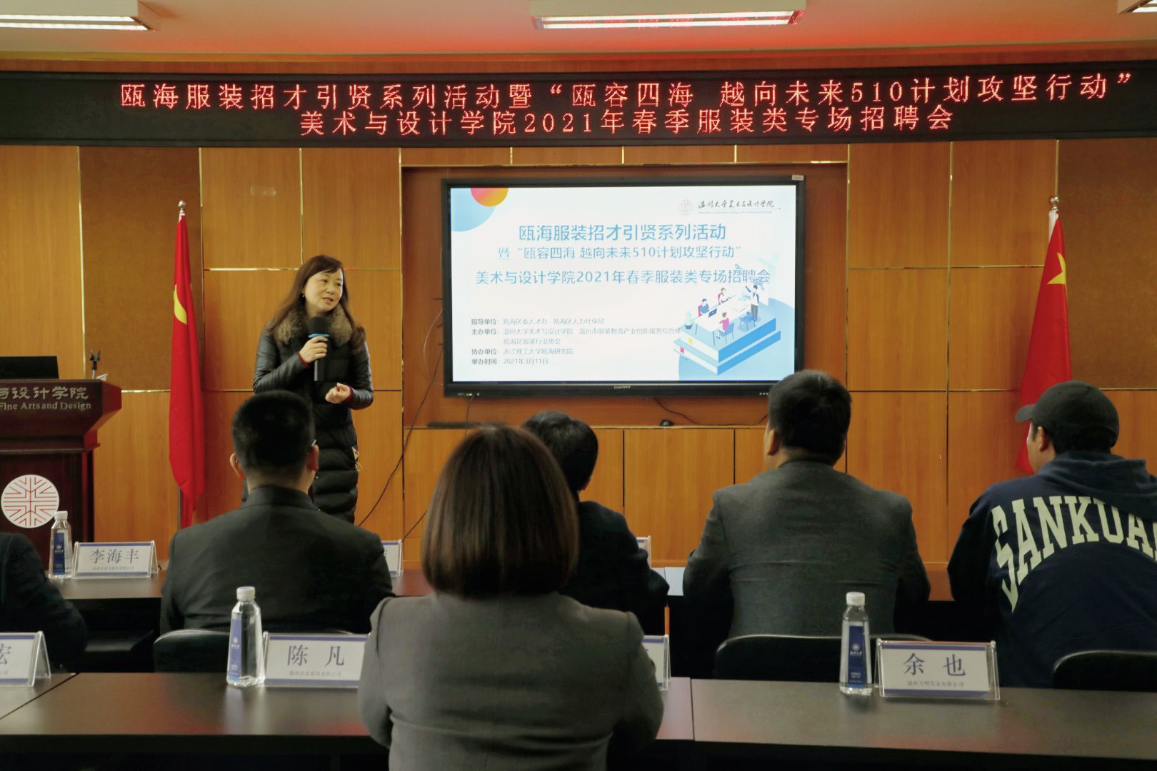 会议开始前,杨丽君副书记简要介绍了近几年色色小说 的发展、人才培养以及毕业生就业的相关情况。随后,瓯海服装行业协会秘书长苏立玲对瓯海服饰产业的基本情况进行解读,浙江理工大学瓯海研究院副院长,温州市服装智造产业创新服务综合体负责人任力介绍了综合体的设计思想,从重点项目、功能分布、设计亮点三部分对每个楼层进行分析。在了解瓯海对于高校大学生留温政策之后,11家企业负责人通过介绍企业、岗位需求、待遇三方面来讲述,为此次参加招聘会的同学提供就业岗位的机会。