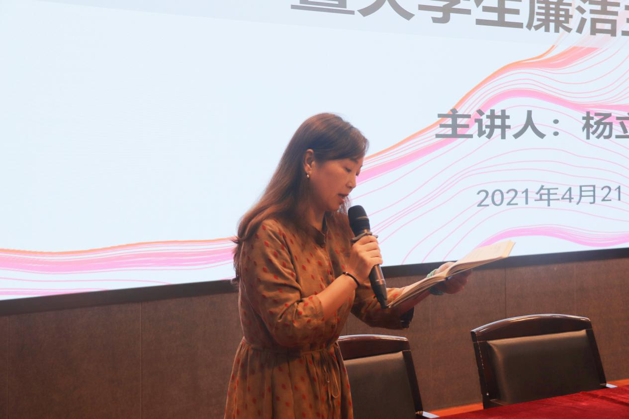 此次会议由色色小说 党委副书记杨丽君老师主持,杨丽君老师首先指出当代思想廉洁教育是我们大学生思想道德教育的重要内容,廉洁教育有助于培养学生正确的价值观和高尚的道德情操,促进社会及教育事业和谐健康发展。杨丽君老师还提到,现在互联网比较通达,网络是一把双刃剑,网络的发展虽有利于我们的生活,但同时也给诈骗分子制造了更多的骗人机会。对于这些骗局,我们应提高防范意识,学会自我保护,掌握一定的防诈骗技巧,共同营造出一个和谐美好的平安校园。