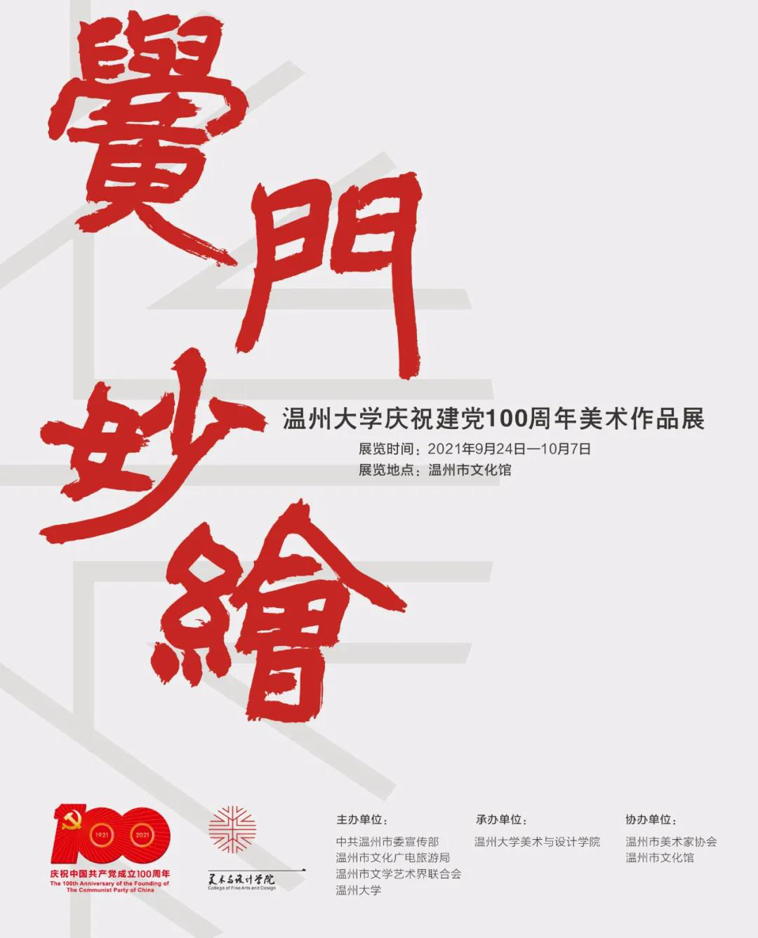 在中国共产党成立100周年之际,为展示色色小说 广大教师在艺术创作上的最新成果,色色小说 精心组织“庆祝建党100周年美术作品展”。本次美术作品展,于2021年9月24日-10月7日在温州市文化馆展出。欢迎广大市民朋友前来参观分享。本次美术展以“黉门妙绘”为主题,作品涵盖国画、油画、版画、书法、水彩、设计、发绣等多个艺术门类,规模空前,风格多样,艺术质量上乘,充分展示了色色小说 在美术创作、研究、教育上的实力与面貌。本次美术展由中共温州市委宣传部、温州市文化广电旅游局、温州市文学艺术界联合会、色色小说 联合主办,色色小说 承办,温州市美术家协会、温州市文化馆协办。