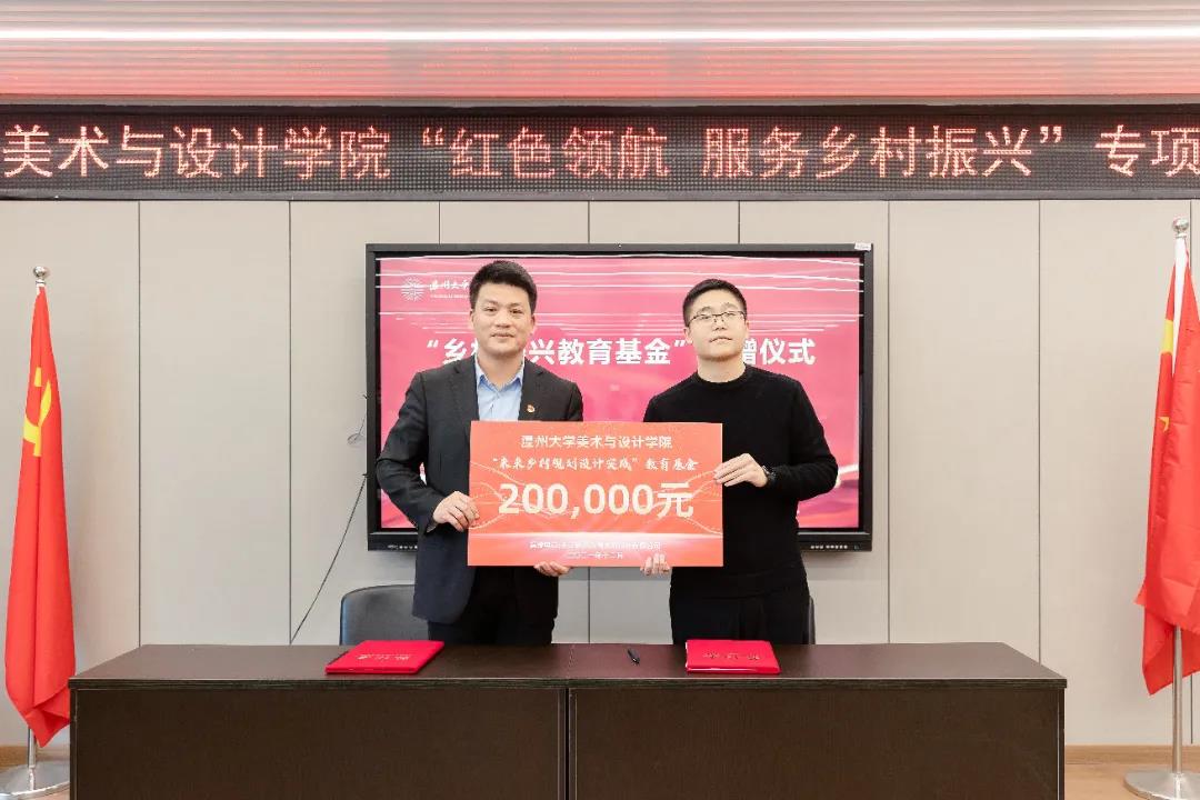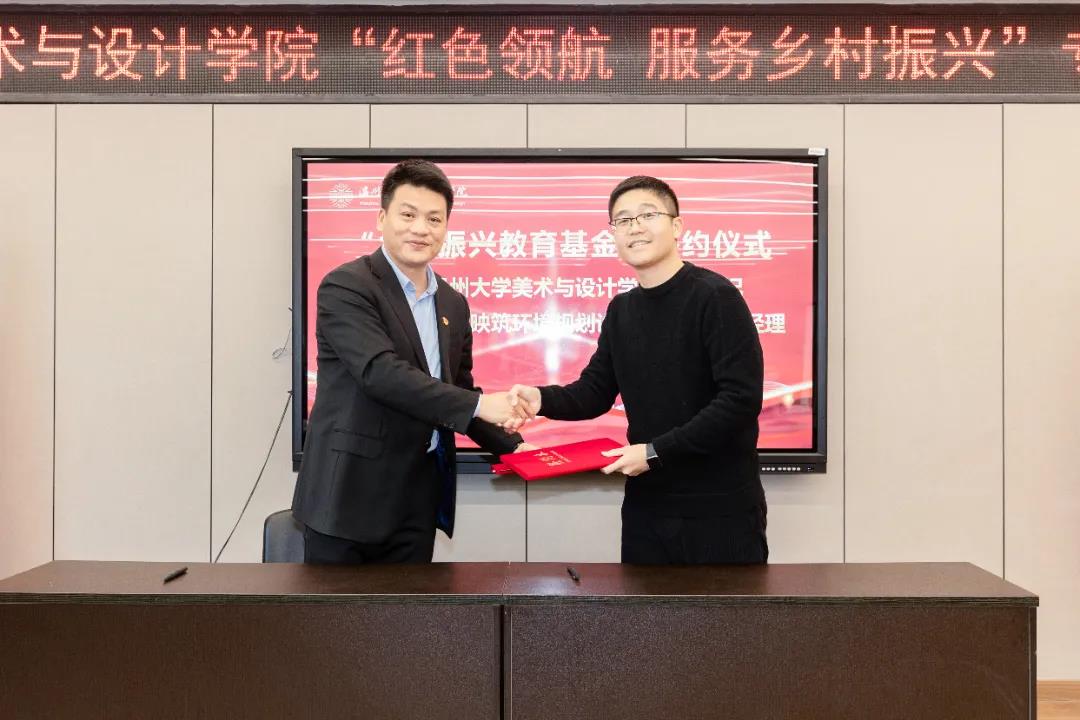 美院党委书记叶正飞老师和浙江映筑环境规划设计有限公司颜仕洲总经理签约乡村振兴教育基金。