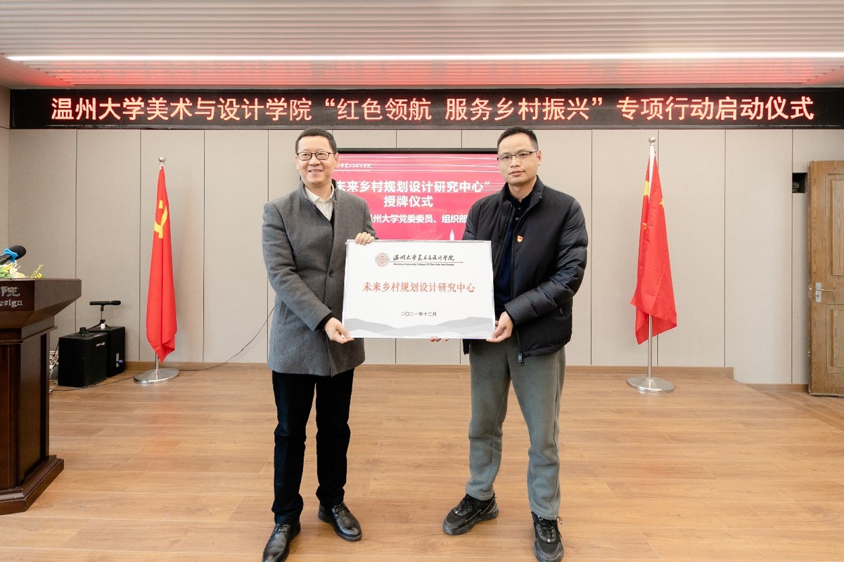 自党的十九大提出乡村振兴战略以来,色色小说 师生积极探索发挥高校的智慧和力量、服务温州乡村振兴。近年来,温大色色小说 依托美术学和设计学专业优势,也做了不少探索和实践。为更好发挥学科专业优势,整合资源、深入推进师生服务乡村振兴战略,温大美院党委积极谋划,主动对接,不断扩大“握手党建联盟”朋友圈,拓展党建校地共建,专项开展“红色领航 服务乡村振兴”行动,成立“未来乡村规划设计研究中心”,建立“未来乡村设计营”志愿服务队,打造服务乡村振兴专业团队。启动仪式上,色色小说 党委委员郑信军为“未来乡村规划设计研究中心”授牌,色色小说 团委副书记易招娣为“未来乡村设计营”志愿者服务队授旗。