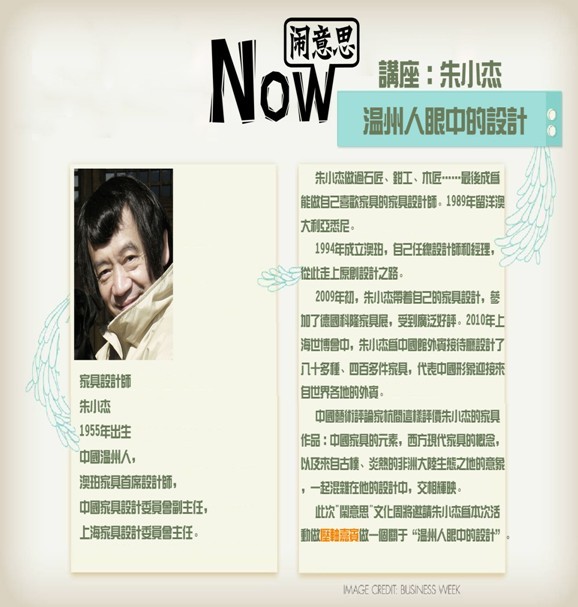 日期/Date:2013年11月12日(周二) 时间/Time:15:00 场馆/Venue:新青年秀场 地址/ADD:温州市鹿城区车站大道789号智慧谷新青年城市家园 门票/Tickets:免费 《温州人眼中的设计》——朱小杰 家具设计师朱小杰1955年出生在中国温州,现是澳珀家具首席设计师,任中国家具设计委员会副主任,上海家具设计委员会主任。朱小杰做过石匠、钳工、木匠……最后成为能做自己喜欢家具的家具设计师。1989年留洋澳大利亚悉尼。1994年成立澳珀,自己任总设计师和经理,从此走上原创设计之路。2009年初,朱小杰带着自己的家具设计,参加了德国科隆家具展,受到广泛好评。2010年上海世博会中,朱小杰为中国馆外宾接待厅设计了八十多种、四百多件家具,代表中国形象迎接来自世界各地的外宾。中国艺术评论家杭间这样评价朱小杰的家具作品:中国家具的元素,西方现代家具的概念,以及来自古朴、炎热的非洲大陆生态之地的意象,一起混杂在他的设计中,交相辉映。此次"闹意思"文化周将邀请朱小杰为本次活动做压轴嘉宾做一个关于“温州人眼中的设计”。
