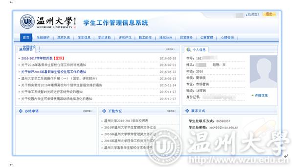学工系统是贯穿大学生活的一个很重要的信息媒介。可在系统中的下载专区下载学校相关的各类文件,可在系统中办理个人信息维护、学生干部职务申请、评奖评优申请、各类资助申请、勤工助学岗位申请、勤工助学工资发放、日常事务(假期管理、假期留校申请、场地申请)等。请新生同学们尽快将学工系统中的个人信息进行维护,并在以后的大学生活中将信息不断更新,以便不影响在校期间接受各类紧急信息及各项事务办理。个人信息维护示意图如下: