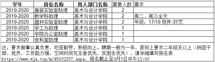 现各办公室招募勤工岗位,要求做事认真负责,吃苦耐劳,积极向上。聘期一般为一年,原则上要求二年级及以上(班团干部、党员、工作能力强优先,空闲时间充足者优先,贫困生优先),请详细填写报名表//www.wjx.top/m/45032257.aspx,报名截止至9月3日中午12:00。