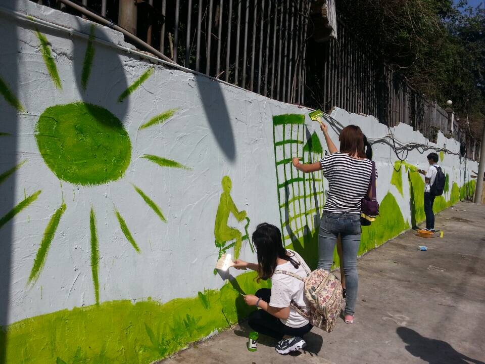 受茶山街道梅泉社区居委会的邀请,色色小说 的“艺家人”青年志愿者协会的志愿者们一起参与了该社区“创建文明城市”的墙绘活动。昨日上午8点,大学生们开始在白色空旷的墙壁的作画,以绿色作为主色调,宣传低碳环保的生活理念。100多米的小吃巷外墙被美丽的手绘画所代替,吸引了不少居民驻足观看。